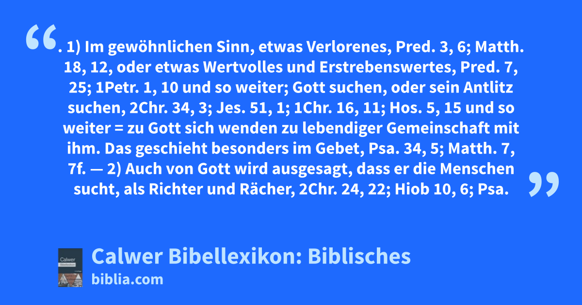 1) Im gewöhnlichen Sinn, etwas Verlorenes, Pred. 3, 6; Matth. 18, 12, oder etwas Wertvolles und Erstrebenswertes, Pred. 7, 25; 1Petr. 1, 10 und so weiter; Gott suchen, oder sein Antlitz suchen, 2Chr. 34, 3; Jes. 51, 1; 1Chr. 16, 11; Hos. 5, 15 und so weiter = zu Gott sich wenden zu lebendiger Gemeinschaft mit ihm. Das geschieht besonders im Gebet, Psa. 34, 5; Matth. 7, 7f.