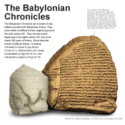 spent 10 years in Teima and set Belshazzar over the affairs of Babylon while he was gone. Belshazzar served as de facto king until the threat of impending invasion brought Nabonidus back. Until the discovery of additional ancient Babylonian records like The Babylonian Chronicles—which are tablets that record the history of Babylon—the depiction of Belshazzar as the last king of Babylon was sometimes used as an example of Daniel’s historical inaccuracy. The Babylonian texts revealed that Nabonidus had made his son Belshazzar co-regent and ruler of Babylon.