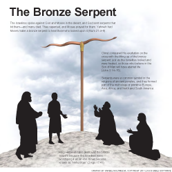 21:4–9 The Israelites again complain about the lack of food and water, using language similar to their previous complaints (e.g., Exod 15:22–17:7; Num 11; 14; 20:1–13). This time, God punishes the people with venomous snakes. After Moses prays for the punishment to cease, God instructs him to make a bronze snake, promising to heal all those who look at it. John 3:14 draws an analogy between Moses lifting this bronze serpent and the metaphorical lifting up of the Son of Man. |