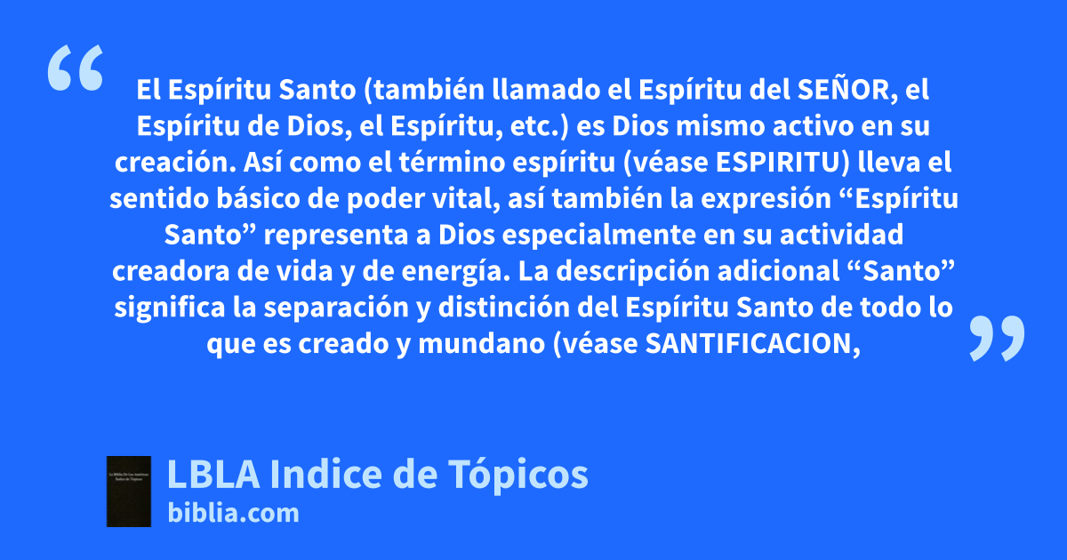 El Espíritu Santo (también llamado el Espíritu del SEÑOR, el Espíritu de Dios, el Espíritu, etc.) es Dios mismo activo en su creación. Así como el término espíritu (véase ESPIRITU) lleva el sentido básico de poder vital, así también la expresión “Espíritu Santo” representa a Dios especialmente en su actividad creadora de vida y de energía. La descripción adicional “Santo” significa la separación y distinción del Espíritu Santo de todo lo que es creado y mundano (véase SANTIFICACION, de Dios). “Santo” entonces es esencialmente el equivalente de lo que es divino, identificando el Espíritu Santo como Dios.