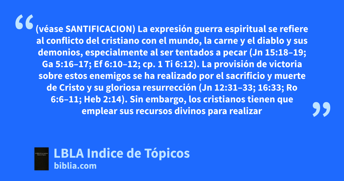 La expresión guerra espiritual se refiere al conflicto del cristiano con el mundo, la carne y el diablo y sus demonios, especialmente al ser tentados a pecar (Jn 15:18–19; Ga 5:16–17; Ef 6:10–12; cp. 1 Ti 6:12). La provisión de victoria sobre estos enemigos se ha realizado por el sacrificio y muerte de Cristo y su gloriosa resurrección (Jn 12:31–33; 16:33; Ro 6:6–11; Heb 2:14). Sin embargo, los cristianos tienen que emplear sus recursos divinos para realizar la victoria en la guerra espiritual contra fuerzas poderosas y malvadas (Ef 6:10–18; cp. 2 Co 10:3–4).