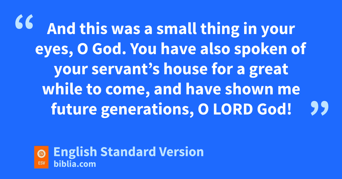 16 Then King David went in and sat before the Lord and said, “Who am I, O Lord God, and what is my house, that you have brought me thus far? 17 And this was a small thing in your eyes, O God. You have also spoken of your servant’s house for a great while to come, and have shown me future generations,1 O Lord God! 18 And what more can David say to you for honoring your servant? For you know your servant. 19 zFor your servant’s sake, O Lord, and according to your own heart, you have done all this greatness, in making known all these great things. 20 There is none like you, O Lord, and there is no God besides you, according to all that we have heard with our ears. 21 And who is like your people Israel, the one2 nation on earth whom God went to redeem to be his people, making for yourself a name for great and awesome things, in driving out nations before your people whom you redeemed from Egypt? 22 And you made your people Israel to be your people forever, and you, O Lord, became their God. 23 And now, O Lord, let the word that you have spoken concerning your servant and concerning his house be established forever, and do as you have spoken, 24 and your name will be established and magnified forever, saying, ‘The Lord of hosts, the God of Israel, is Israel’s God,’ and the house of your servant David will be established before you. 25 For you, my God, have revealed to your servant that you will build a house for him. Therefore your servant has found courage to pray before you. 26 And now, O Lord, you are God, and you have promised this good thing to your servant. 27 Now you have been pleased to bless the house of your servant, that it may continue forever before you, for it is you, O Lord, who have blessed, and it is blessed forever.”