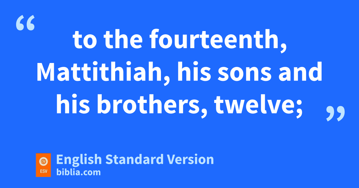 9 The first lot fell for Asaph to Joseph; the second to Gedaliah, to him and his brothers and his sons, twelve; 10 the third to Zaccur, his sons and his brothers, twelve; 11 the fourth to Izri, his sons and his brothers, twelve; 12 the fifth to Nethaniah, his sons and his brothers, twelve; 13 the sixth to Bukkiah, his sons and his brothers, twelve; 14 the seventh to Jesharelah, his sons and his brothers, twelve; 15 the eighth to Jeshaiah, his sons and his brothers, twelve; 16 the ninth to Mattaniah, his sons and his brothers, twelve; 17 the tenth to Shimei, his sons and his brothers, twelve; 18 the eleventh to Azarel, his sons and his brothers, twelve; 19 the twelfth to Hashabiah, his sons and his brothers, twelve; 20 to the thirteenth, Shubael, his sons and his brothers, twelve; 21 to the fourteenth, Mattithiah, his sons and his brothers, twelve; 22 to the fifteenth, to Jeremoth, his sons and his brothers, twelve; 23 to the sixteenth, to Hananiah, his sons and his brothers, twelve; 24 to the seventeenth, to Joshbekashah, his sons and his brothers, twelve; 25 to the eighteenth, to Hanani, his sons and his brothers, twelve; 26 to the nineteenth, to Mallothi, his sons and his brothers, twelve; 27 to the twentieth, to Eliathah, his sons and his brothers, twelve; 28 to the twenty-first, to Hothir, his sons and his brothers, twelve; 29 to the twenty-second, to Giddalti, his sons and his brothers, twelve; 30 to the twenty-third, to Mahazioth, his sons and his brothers, twelve; 31 to the twenty-fourth, to Romamti-ezer, his sons and his brothers, twelve.
