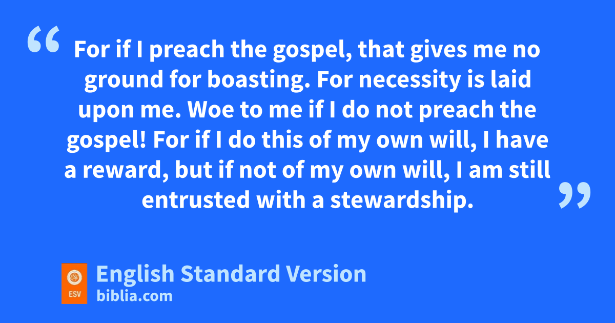 15 But cI have made no use of any of these rights, nor am I writing these things to secure any such provision. For I would rather die than have anyone ddeprive me of my ground for boasting. 16 For if I preach the gospel, that gives me no ground for boasting. For enecessity is laid upon me. Woe to me if I do not preach the gospel! 17 For if I do this of my own will, I have a reward, but if not of my own will, I am still entrusted with fa stewardship. 18 What then is my reward? That in my preaching gI may present the gospel free of charge, so as not to make full use of my right in the gospel.