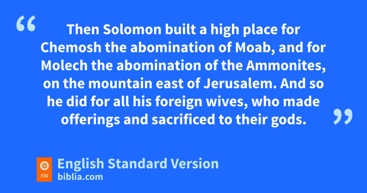 11 Now wKing Solomon loved many foreign women, along with the daughter of Pharaoh: Moabite, Ammonite, Edomite, Sidonian, and Hittite women, 2 from the nations concerning which the Lord had said to the people of Israel, x“You shall not enter into marriage with them, neither shall they with you, for surely they will turn away your heart after their gods.” Solomon clung to these in love. 3 He had 700 wives, who were princesses, and 300 concubines. And his wives turned away his heart. 4 For when Solomon was old his wives turned away his heart after other gods, and yhis heart was not wholly true to the Lord his God, zas was the heart of David his father. 5 For Solomon went after aAshtoreth the goddess of the Sidonians, and after bMilcom the abomination of the Ammonites. 6 So Solomon did what was evil in the sight of the Lord and did not wholly follow the Lord, as David his father had done. 7 Then Solomon built a high place for cChemosh the abomination of Moab, and for dMolech the abomination of the Ammonites, on the mountain east of Jerusalem. 8 And so he did for all his foreign wives, who made offerings and sacrificed to their gods.
