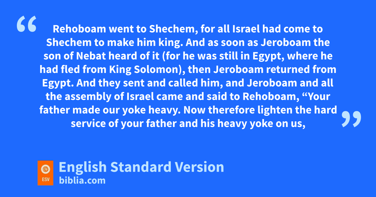 12 iRehoboam went to jShechem, for all Israel had come to Shechem to make him king. 2 And as soon as kJeroboam the son of Nebat heard of it (for lhe was still in Egypt, where he had fled from King Solomon), then Jeroboam returned from1 Egypt. 3 And they sent and called him, and Jeroboam and all the assembly of Israel came and said to Rehoboam, 4 m“Your father made our yoke heavy. Now therefore lighten the hard service of your father and his heavy yoke on us, and we will serve you.” 5 He said to them, n“Go away for three days, then come again to me.” So the people went away.