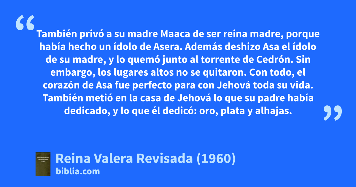 9En el año veinte de Jeroboam rey de Israel, Asa comenzó a reinar sobre Judá. 10Y reinó cuarenta y un años en Jerusalén; el nombre de su madre fue Maaca, hija de Abisalom. 11Asa hizo lo recto ante los ojos de Jehová, como David su padre. 12Porque quitó del país a los sodomitas, y quitó todos los ídolos que sus padres habían hecho.d 13También privó a su madre Maaca de ser reina madre, porque había hecho un ídolo de Asera. Además deshizo Asa el ídolo de su madre, y lo quemó junto al torrente de Cedrón. 14Sin embargo, los lugares altos no se quitaron. Con todo, el corazón de Asa fue perfecto para con Jehová toda su vida. 15También metió en la casa de Jehová lo que su padre había dedicado, y lo que él dedicó: oro, plata y alhajas.