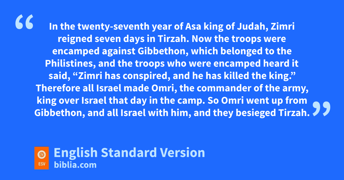 15 In the twenty-seventh year of Asa king of Judah, Zimri reigned seven days in Tirzah. Now the troops were encamped against dGibbethon, which belonged to the Philistines, 16 and the troops who were encamped heard it said, “Zimri has conspired, and he has killed the king.” Therefore all Israel made Omri, the commander of the army, king over Israel that day in the camp. 17 So Omri went up from Gibbethon, and all Israel with him, and they besieged Tirzah. 18 And when Zimri saw that the city was taken, he went into the citadel of the king’s house and burned the king’s house over him with fire and died, 19 because of his sins that he committed, doing evil in the sight of the Lord, ewalking in the way of Jeroboam, and for his sin which he committed, making Israel to sin. 20 Now the rest of the acts of Zimri, and the conspiracy that he made, are they not written in the Book of the Chronicles of the Kings of Israel?