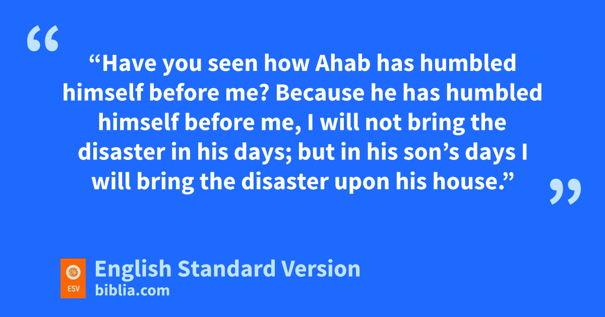 27 And when Ahab heard those words, he otore his clothes and pput sackcloth on his flesh and qfasted and lay in sackcloth and went about dejectedly. 28 And the word of the Lord came to Elijah the Tishbite, saying, 29 “Have you seen how Ahab has humbled himself before me? Because he has humbled himself before me, I will not bring the disaster in his days; rbut in his son’s days I will bring the disaster upon his house.”