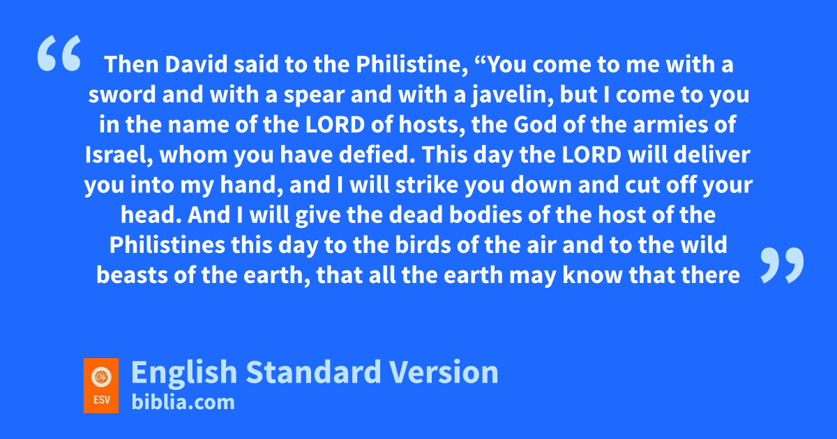 41 And the Philistine moved forward and came near to David, hwith his shield-bearer in front of him. 42 And when the Philistine looked and saw David, he disdained him, for he was but a youth, iruddy and handsome in appearance. 43 And the Philistine said to David, “Am I ja dog, that you come to me with sticks?” And the Philistine cursed David by his gods. 44 The Philistine said to David, “Come to me, and I will give your flesh kto the birds of the air and to the beasts of the field.” 45 Then David said to the Philistine, “You come to me with a sword and with a spear and with la javelin, but I come to you in the name of the Lord of hosts, the God of the armies of Israel, ewhom you have defied. 46 This day the Lord will deliver you into my hand, and I will strike you down and cut off your head. mAnd I will give the dead bodies of the host of the Philistines this day nto the birds of the air and to the wild beasts of the earth, othat all the earth may know that there is a God in Israel, 47 and that all this assembly may know that pthe Lord saves not with sword and spear. qFor the battle is the Lord’s, and he will give you into our hand.”