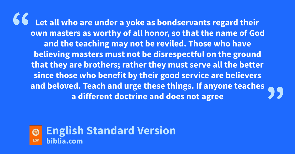 6 oLet all who are under a yoke as bondservants1 regard their own masters as worthy of all honor, pso that the name of God and the teaching may not be reviled. 2 Those who have believing masters must not be disrespectful on the ground that they are qbrothers; rather they must serve all the better since those who benefit by their good service are believers and beloved.
