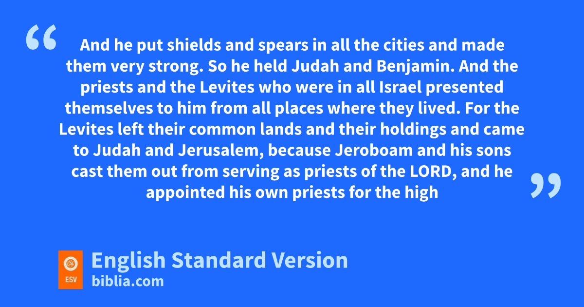 13 And the priests and the Levites who were in all Israel presented themselves to him from all places where they lived. 14 For the Levites left ptheir common lands and their holdings and came to Judah and Jerusalem, qbecause Jeroboam and his sons cast them out from serving as priests of the Lord, 15 and he appointed his own rpriests for the high places and for the goat idols and for sthe calves that he had made. 16 tAnd those who had set their hearts to seek the Lord God of Israel came after them from all the tribes of Israel to Jerusalem to sacrifice to the Lord, the God of their fathers. 17 uThey strengthened the kingdom of Judah, and for three years they made Rehoboam the son of Solomon secure, for they walked for three years in the way of David and Solomon.