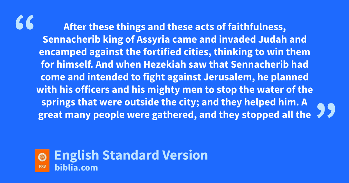 32 iAfter these things and these acts of faithfulness, Sennacherib king of Assyria came and invaded Judah and encamped against the fortified cities, thinking to win them for himself. 2 And when Hezekiah saw that Sennacherib had come and intended to fight against Jerusalem, 3 he planned with his officers and his mighty men to stop the water of the springs that were outside the city; and they helped him. 4 A great many people were gathered, and they stopped all the springs and jthe brook that flowed through the land, saying, “Why should the kings of Assyria come and find much water?” 5 He set to work resolutely and built up kall the wall that was broken down and raised towers upon it,1 and outside it he built another wall, and he strengthened the lMillo in the city of David. He also made weapons and shields in abundance. 6 And he set combat commanders over the people and gathered them together to him in the square at the gate of the city and spoke mencouragingly to them, saying, 7 n“Be strong and courageous. oDo not be afraid or dismayed before the king of Assyria and all the horde that is with him, pfor there are more with us than with him. 8 With him is qan arm of flesh, rbut with us is the Lord our God, to help us and to fight our battles.” And the people took confidence from the words of Hezekiah king of Judah.
