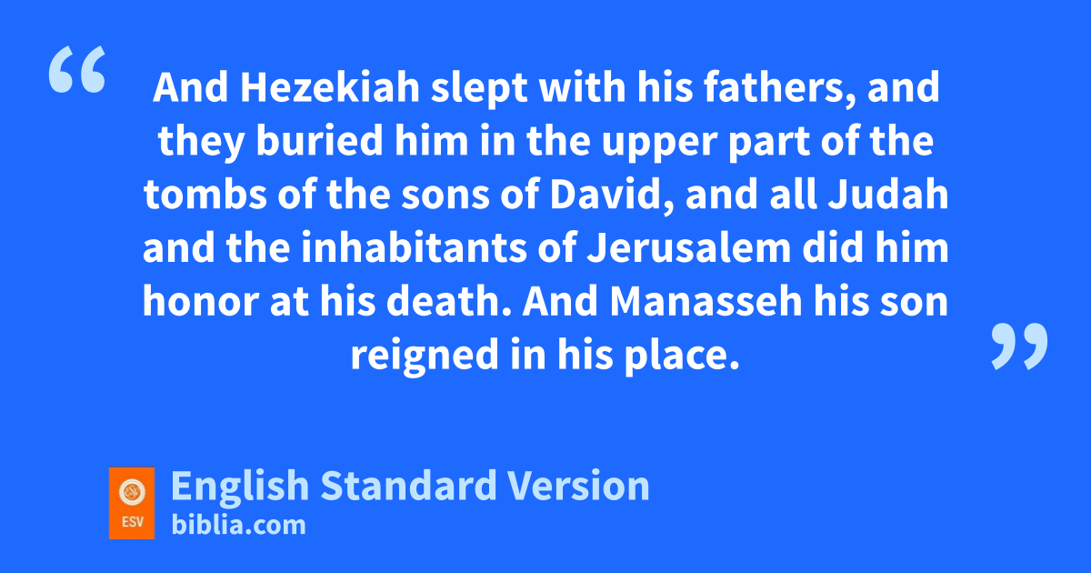 32 Now the rest of the acts of Hezekiah and his good deeds, behold, they are written gin the vision of Isaiah the prophet, the son of Amoz, hin the Book of the Kings of Judah and Israel. 33 And Hezekiah slept with his fathers, and they buried him in the iupper part of the tombs of the sons of David, and all Judah and the inhabitants of Jerusalem did him honor at his death. And Manasseh his son reigned in his place.