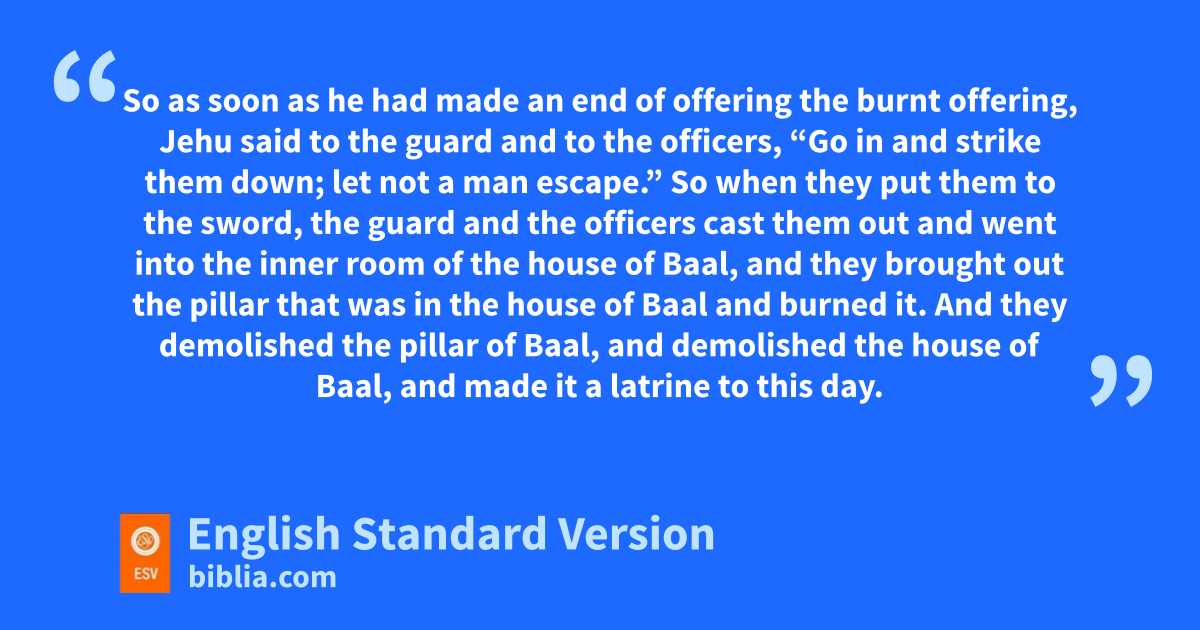 Now Jehu had stationed eighty men outside and said, “The man who allows any of those whom I give into your hands to escape ishall forfeit his life.” 25 So as soon as he had made an end of offering the burnt offering, Jehu said to the guard and to the officers, j“Go in and strike them down; let not a man escape.” So when they put them to the sword, the guard and the officers cast them out and went into the inner room of the house of Baal, 26 and they brought out the kpillar that was in hthe house of Baal and burned it. 27 And they demolished the kpillar of Baal, and demolished the house of Baal, and made it la latrine to this day.