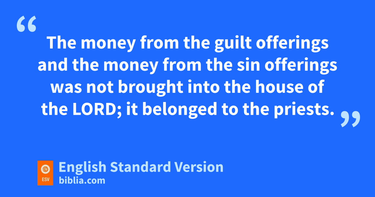9 Then Jehoiada the priest took ua chest and bored a hole in the lid of it and set it beside the altar on the right side as one entered the house of the Lord. And the priests who guarded the threshold put in it all the money that was brought into the house of the Lord. 10 And whenever they saw that there was much money in the chest, the king’s secretary and the high priest came up and they bagged and counted vthe money that was found in the house of the Lord. 11 Then they would give the money that was weighed out into the hands of the workmen who had the oversight of the house of the Lord. And they paid it out to the carpenters and the builders who worked on the house of the Lord, 12 and wto the masons and the stonecutters, as well as to buy timber and quarried stone for making repairs on the house of the Lord, and for any outlay for the repairs of the house. 13 xBut there were not made for the house of the Lord ybasins of silver, snuffers, bowls, trumpets, or any vessels of gold, or of silver, from the money that was brought into the house of the Lord, 14 for that was given to the workmen who were repairing the house of the Lord with it. 15 And zthey did not ask for an accounting from the men into whose hand they delivered the money to pay out to the workmen, for they dealt honestly. 16 The money from athe guilt offerings and the money from the bsin offerings was not brought into the house of the Lord; cit belonged to the priests.