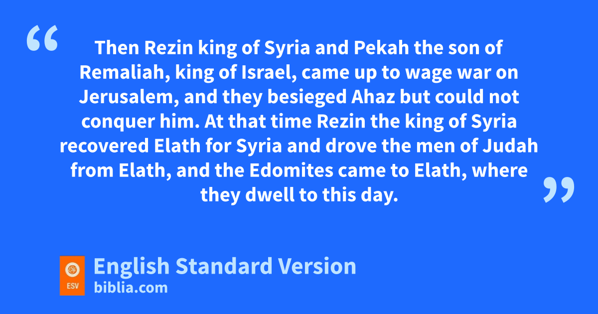 5 dThen Rezin king of Syria and dPekah the son of Remaliah, king of Israel, came up to wage war on Jerusalem, and they besieged Ahaz ebut could not conquer him. 6 At that time Rezin the king of Syria recovered fElath for Syria and drove the men of Judah from fElath, and the Edomites came to Elath, where they dwell to this day. 7 gSo Ahaz sent messengers to hTiglath-pileser king of Assyria, saying, “I am your servant and your son. Come up and rescue me from the hand of the king of Syria and from the hand of the king of Israel, who are attacking me.” 8 Ahaz also itook the silver and gold that was found in the house of the Lord and in the treasures of the king’s house and sent a present to the king of Assyria. 9 jAnd the king of Assyria listened to him. The king of Assyria marched up against Damascus kand took it, carrying its people captive to lKir, and he killed Rezin.