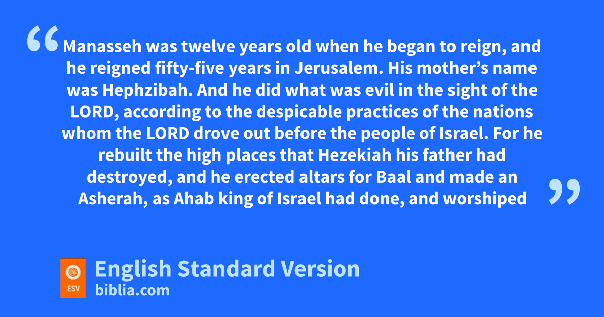 21 xManasseh was twelve years old when he began to reign, and he reigned fifty-five years in Jerusalem. His mother’s name was Hephzibah. 2 And he did what was evil in the sight of the Lord, yaccording to the despicable practices of the nations whom the Lord drove out before the people of Israel. 3 For he rebuilt the high places zthat Hezekiah his father had destroyed, and he erected altars for Baal and made aan Asherah, bas Ahab king of Israel had done, cand worshiped all the host of heaven and served them. 4 dAnd he built altars in the house of the Lord, of which the Lord had said, e“In Jerusalem will I put my name.” 5 And he built altars cfor all the host of heaven in fthe two courts of the house of the Lord. 6 gAnd he burned his son as an offering1 and hused fortune-telling and iomens and dealt jwith mediums and with necromancers. He did much evil in the sight of the Lord, provoking him to anger. 7 And the carved image of aAsherah that he had made he set in the house of which the Lord said to David and to Solomon his son, “In this house, eand in Jerusalem, which I have chosen out of all the tribes of Israel, I will put my name forever. 8 kAnd I will not cause the feet of Israel to wander anymore out of the land that I gave to their fathers, if only they will be careful to do according to all that I have commanded them, and according to all the Law that my servant Moses commanded them.” 9 But they did not listen, and Manasseh led them astray to do more evil than the nations had done whom the Lord destroyed before the people of Israel.