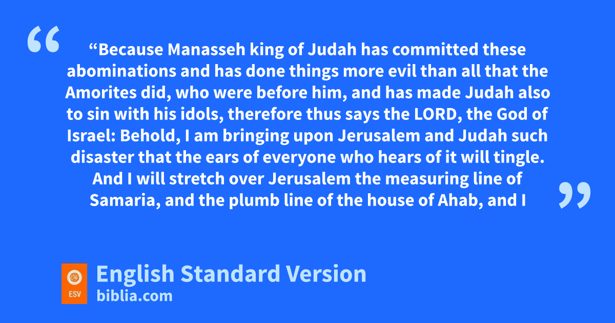 10 And the Lord said by his servants the prophets, 11 l“Because Manasseh king of Judah has committed these abominations and has done things mmore evil than all that the Amorites did, who were before him, nand has made Judah also to sin owith his idols, 12 therefore thus says the Lord, the God of Israel: Behold, I am bringing upon Jerusalem and Judah such disaster2 that the ears of everyone who hears of it pwill tingle. 13 qAnd I will stretch over Jerusalem the measuring line of Samaria, and the plumb line of the house of Ahab, and I will wipe Jerusalem as one wipes a dish, wiping it and turning it upside down. 14 And I will forsake the remnant of my heritage and give them into the hand of their enemies, and they shall become a prey and a spoil to all their enemies, 15 because they have done what is evil in my sight and have provoked me to anger, since the day their fathers came out of Egypt, even to this day.”
