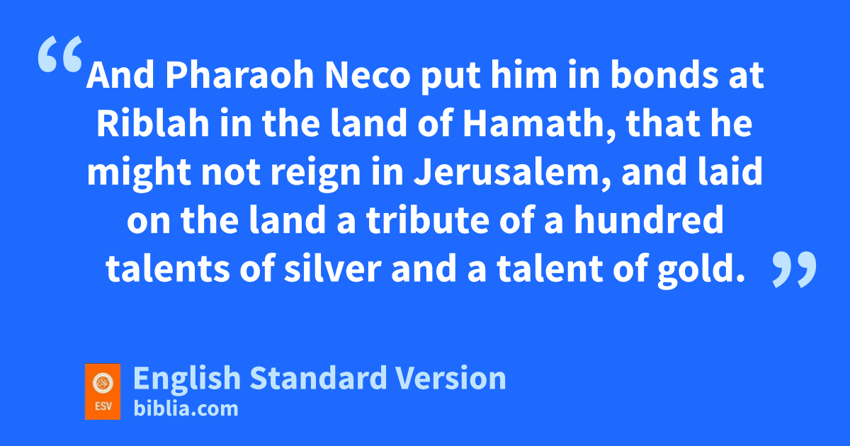 31 bJehoahaz was twenty-three years old when he began to reign, and he reigned three months in Jerusalem. His mother’s name was cHamutal the daughter of Jeremiah of Libnah. 32 And he did what was evil in the sight of the Lord, daccording to all that his fathers had done. 33 And xPharaoh Neco put him in bonds at eRiblah in the land of fHamath, that he might not reign in Jerusalem, and laid on the land a tribute of a hundred talents6 of silver and a talent of gold. 34 And xPharaoh Neco made Eliakim the son of Josiah king in the place of Josiah his father, and gchanged his name to Jehoiakim. But he took Jehoahaz away, hand he came to Egypt and died there. 35 And Jehoiakim igave the silver and the gold to Pharaoh, but he taxed the land to give the money according to the command of Pharaoh. He exacted the silver and the gold of the people of the land, from everyone according to his assessment, to give it to Pharaoh Neco.