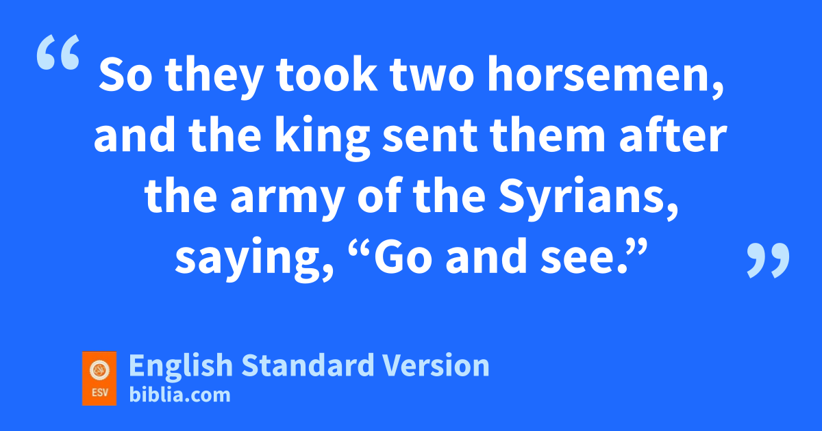 9 Then they said to one another, “We are not doing right. This day is a day of good news. If we are silent and wait until the morning light, punishment will overtake us. Now therefore come; let us go and tell the king’s household.” 10 So they came and called to the gatekeepers of the city and told them, “We came to the camp of the Syrians, and behold, there was no one to be seen or heard there, nothing but the horses tied and the donkeys tied and the tents as they were.” 11 Then the gatekeepers called out, and it was told within the king’s household. 12 And the king rose in the night and said to his servants, “I will tell you what the Syrians have done to us. They know that we are hungry. Therefore they have gone out of the camp to hide themselves in the open country, thinking, ‘When they come out of the city, we shall take them alive and get into the city.’ ” 13 And one of his servants said, “Let some men take five of the remaining horses, seeing that those who are left here will fare like the whole multitude of Israel who have already perished. Let us send and see.” 14 So they took two horsemen, and the king sent them after the army of the Syrians, saying, “Go and see.” 15 So they went after them as far as the Jordan, and behold, all the way was littered with garments and equipment that the Syrians had thrown away in their haste. And the messengers returned and told the king.
