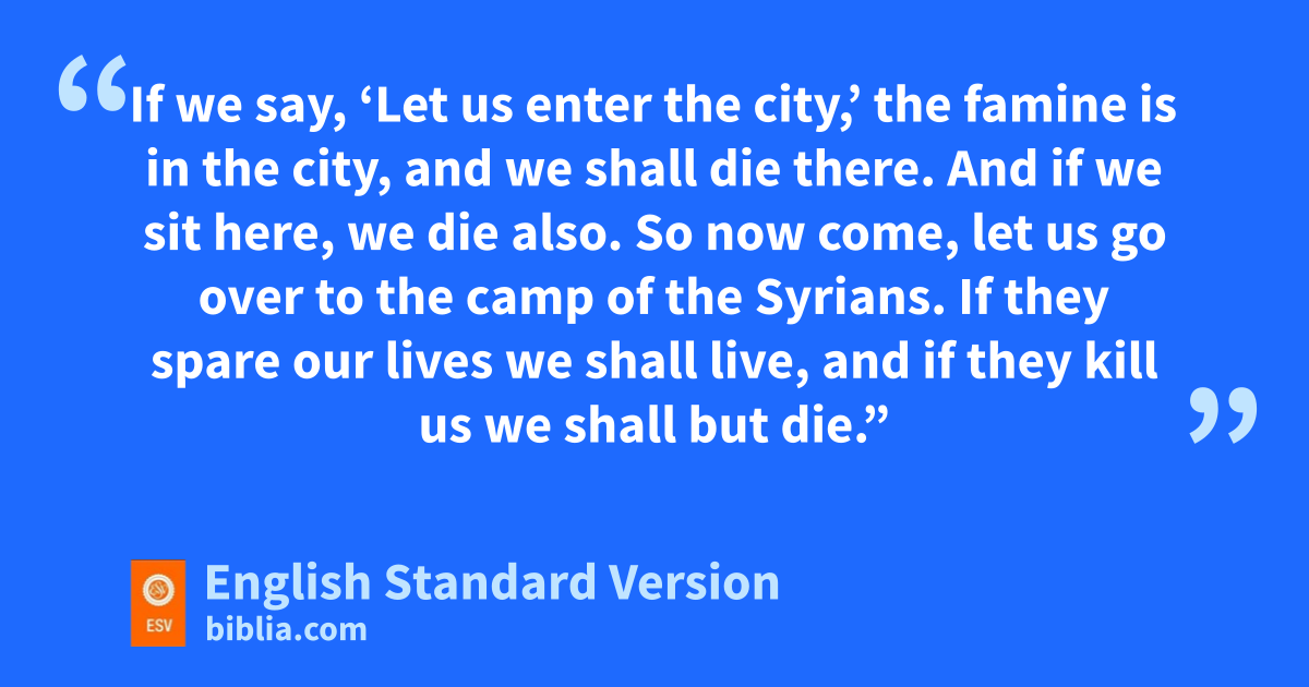 3 Now there were four men who were lepers3 iat the entrance to the gate. And they said to one another, “Why are we sitting here until we die? 4 If we say, ‘Let us enter the city,’ the famine is in the city, and we shall die there. And if we sit here, we die also. So now come, let us go over to the camp of the Syrians. If they spare our lives we shall live, and if they kill us we shall but die.” 5 So they arose at twilight to go to the camp of the Syrians. But when they came to the edge of the camp of the Syrians, behold, there was no one there. 6 For the Lord had made the army of the Syrians jhear the sound of chariots and of horses, the sound of a great army, so that they said to one another, “Behold, the king of Israel has hired against us kthe kings of the Hittites and the kings of Egypt to come against us.” 7 lSo they fled away in the twilight and abandoned their tents, their horses, and their donkeys, leaving the camp as it was, and fled for their lives. 8 And when these lepers came to the edge of the camp, they went into a tent and ate and drank, and they carried off silver and gold and clothing and went and hid them. Then they came back and entered another tent and carried off things from it and went and hid them.