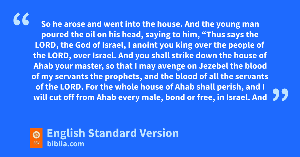 4 So the young man, the servant of the prophet, went to Ramoth-gilead. 5 And when he came, behold, the commanders of the army were in council. And he said, “I have a word for you, O commander.” And Jehu said, “To which of us all?” And he said, “To you, O commander.” 6 So he arose and went into the house. And the young man poured the oil on his head, saying to him, “Thus says the Lord, the God of Israel, iI anoint you king over the people of the Lord, over Israel. 7 And you shall strike down the house of Ahab your master, so that I may avenge jon Jezebel the blood of my servants the prophets, and the blood of all the servants of the Lord. 8 For the whole house of Ahab shall perish, kand I will cut off from Ahab levery male, mbond or free, in Israel. 9 And I will make the house of Ahab like nthe house of Jeroboam the son of Nebat, and like othe house of Baasha the son of Ahijah. 10 pAnd the dogs shall eat Jezebel in the territory of Jezreel, and none shall bury her.” Then he opened the door and fled.