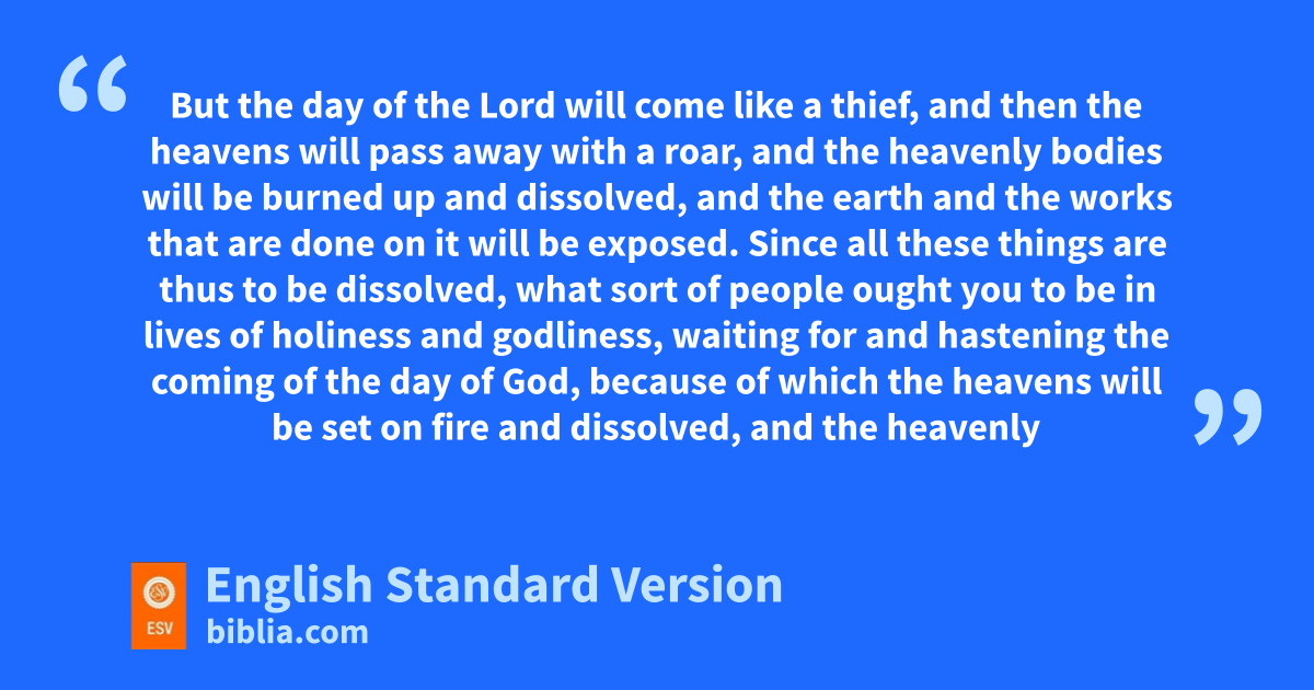 11 Since all these things are thus to be dissolved, cwhat sort of people ought you to be in lives of holiness and godliness, 12 dwaiting for and hastening the coming of the day of God, because of which the heavens will be set on fire and dissolved, and ethe heavenly bodies will melt as they burn! 13 But according to his promise we are waiting for fnew heavens and a new earth gin which righteousness dwells.