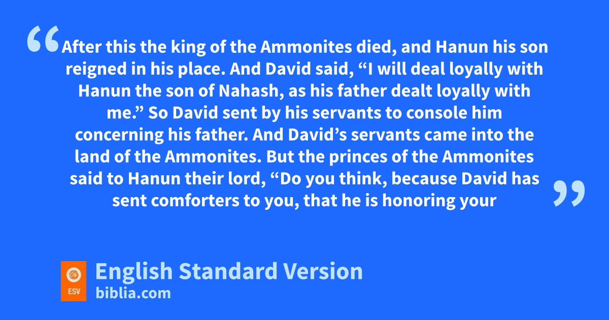 10 sAfter this the king of the Ammonites died, and Hanun his son reigned in his place. 2 And David said, “I will deal loyally1 with Hanun the son of tNahash, as his father dealt loyally with me.” So David sent by his servants to console him concerning his father. And David’s servants came into the land of the Ammonites. 3 But the princes of the Ammonites said to Hanun their lord, “Do you think, because David has sent comforters to you, that he is honoring your father? Has not David sent his servants to you to search the city and to spy it out and to overthrow it?” 4 So Hanun took David’s servants and shaved off half the beard of each and cut off their garments in the middle, uat their hips, and sent them away. 5 When it was told David, he sent to meet them, for the men were greatly ashamed. And the king said, “Remain at Jericho until your beards have grown and then return.”