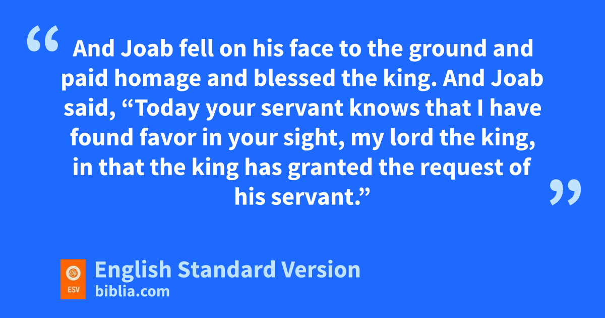21 Then the king said to Joab, “Behold now, I grant this; go, bring back the young man Absalom.” 22 And Joab fell on his face to the ground and paid homage pand blessed the king. And Joab said, “Today your servant knows that I have found favor in your sight, my lord the king, in that the king has granted the request of his servant.” 23 So Joab arose and went to qGeshur and brought Absalom to Jerusalem. 24 And the king said, “Let him dwell apart in his own house; he is not to come into my presence.” So Absalom lived apart in his own house and did not come into the king’s presence.