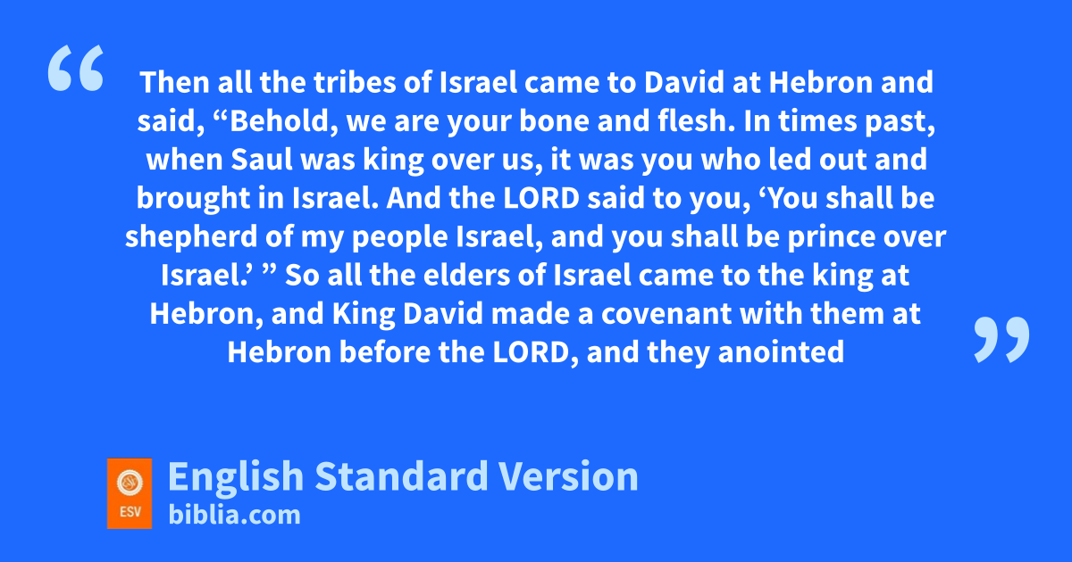 5 Then all the tribes of Israel ucame to David at Hebron and said, “Behold, vwe are your bone and flesh. 2 In times past, when Saul was king over us, wit was you who led out and brought in Israel. And the Lord said to you, x‘You shall be shepherd of my people Israel, and you shall be prince1 over Israel.’ ” 3 So all the elders of Israel came to the king at Hebron, yand King David made a covenant with them at Hebron zbefore the Lord, and they anointed David king over Israel. 4 David was thirty years old when he began to reign, and ahe reigned forty years. 5 aAt Hebron he reigned over Judah bseven years and six months, and at Jerusalem he reigned over all Israel and Judah thirty-three years.2