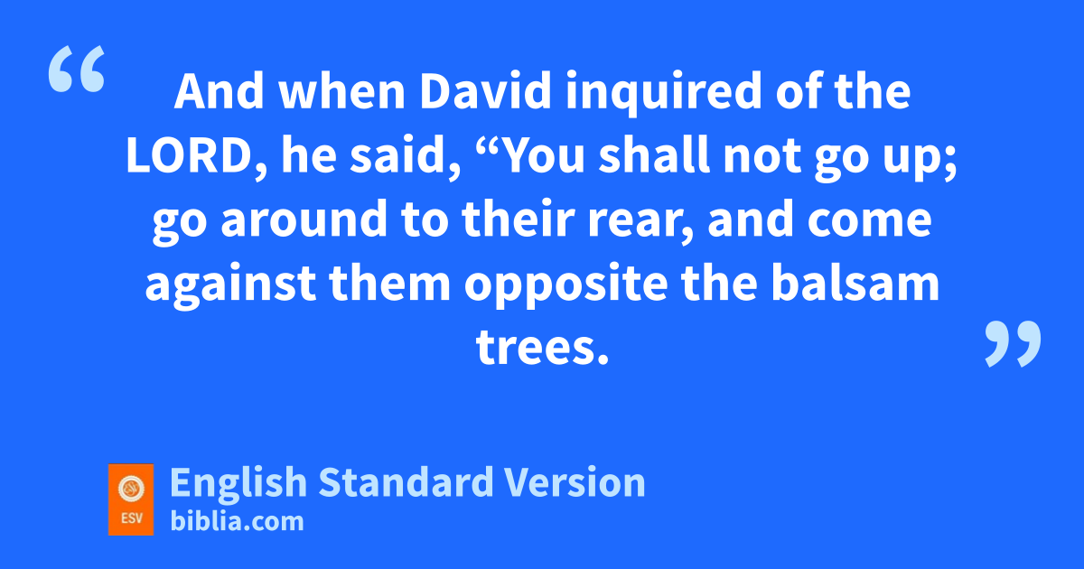 22 And the Philistines came up yet again oand spread out in the Valley of Rephaim. 23 pAnd when David inquired of the Lord, he said, “You shall not go up; go around to their rear, and come against them opposite the balsam trees. 24 And qwhen you hear the sound of marching in the tops of the balsam trees, then rouse yourself, rfor then the Lord has gone out before you to strike down the army of the Philistines.” 25 And David did as the Lord commanded him, and struck down the Philistines from Geba sto Gezer.