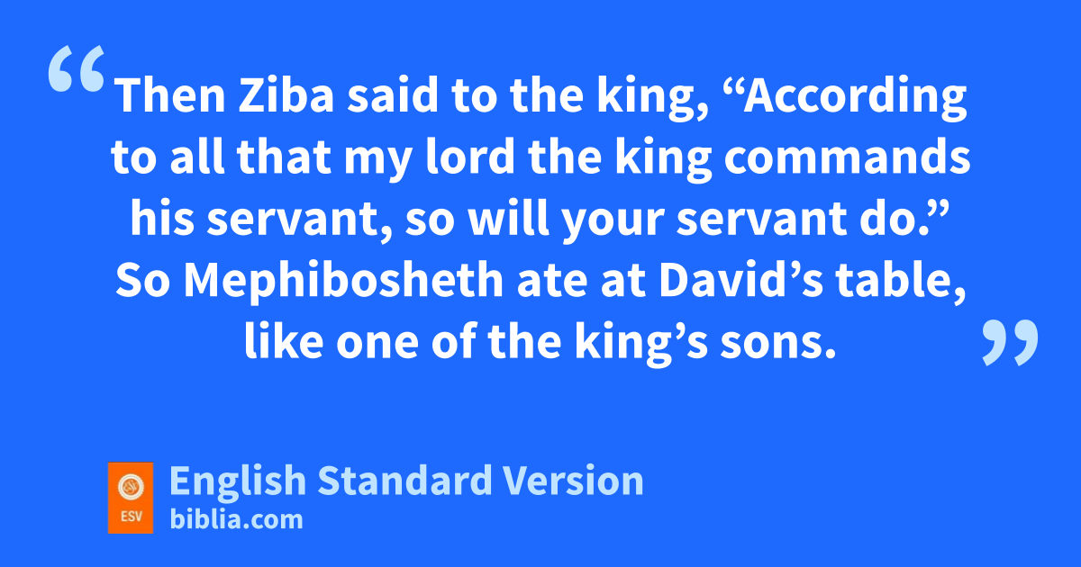 9 Then the king called Ziba, Saul’s servant, and said to him, “All that belonged to Saul and to all his house I have given to your master’s grandson. 10 And you and your sons and your servants shall till the land for him and shall bring in the produce, that your master’s grandson may have bread to eat. But Mephibosheth your master’s grandson oshall always eat at my table.” Now Ziba had qfifteen sons and twenty servants. 11 Then Ziba said to the king, “According to all that my lord the king commands his servant, so will your servant do.” So Mephibosheth oate at David’s1 table, like one of the king’s sons. 12 And Mephibosheth had a young son, rwhose name was Mica. And all who lived in Ziba’s house became Mephibosheth’s servants. 13 So Mephibosheth lived in Jerusalem, for ohe ate always at the king’s table. Now lhe was lame in both his feet.