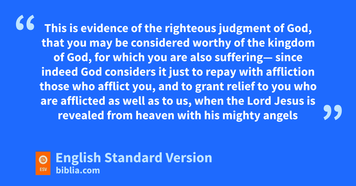 5 This is fevidence of the righteous judgment of God, that you may be gconsidered worthy of the kingdom of God, for which you are also suffering— 6 since indeed God considers it hjust ito repay with affliction those who afflict you, 7 and to grant jrelief to you who are afflicted as well as to us, when kthe Lord Jesus is revealed from heaven lwith his mighty angels 8 min flaming fire, inflicting vengeance on those nwho do not know God and on those who odo not obey the gospel of our Lord Jesus. 9 They will suffer the punishment of peternal destruction, qaway from2 the presence of the Lord and from the glory of his might, 10 rwhen he comes on sthat day tto be glorified in his saints, and to be marveled at among all who have believed, because our utestimony to you vwas believed. 11 To this end we walways pray for you, that our God may xmake you worthy of his calling and may fulfill every resolve for good and every ywork of faith by his power, 12 so that the name of our Lord Jesus zmay be glorified in you, and you in him, according to the grace of our God and the Lord Jesus Christ.