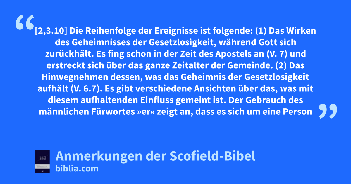 (1) Das Wirken des Geheimnisses der Gesetzlosigkeit, während Gott sich zurückhält. Es fing schon in der Zeit des Apostels an (V. 7) und erstreckt sich über das ganze Zeitalter der Gemeinde.
