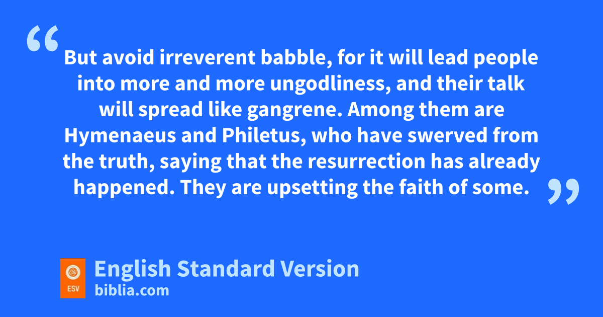 14 Remind them of these things, and ycharge them before God2 znot to quarrel about words, awhich does no good, but only ruins the hearers. 15 Do your best to present yourself to God as one approved,3 a worker bwho has no need to be ashamed, rightly handling the word of truth. 16 But cavoid dirreverent babble, for it will lead people into more and more ungodliness, 17 and their talk will spread like gangrene. Among them are eHymenaeus and Philetus, 18 who have swerved from the truth, fsaying that the resurrection has already happened. They are upsetting the faith of some. 19 But God’s firm foundation stands, bearing this seal: g“The Lord knows those who are his,” and, “Let everyone hwho names the name of the Lord depart from iniquity.”