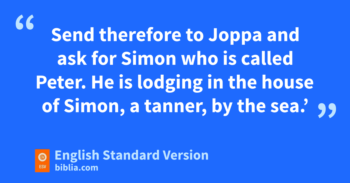 10 At Caesarea there was a man named Cornelius, a centurion of wwhat was known as the Italian Cohort, 2 a devout man xwho feared God with all his household, gave alms generously to the people, and prayed continually to God. 3 yAbout the ninth hour of the day1 zhe saw clearly in a vision aan angel of God come in and say to him, “Cornelius.” 4 And he stared at him in terror and said, “What is it, Lord?” And he said to him, “Your prayers and your alms bhave ascended cas a memorial before God. 5 And now send men to Joppa and bring one Simon who is called Peter. 6 He is lodging dwith one Simon, a tanner, whose house is by the sea.” 7 When the angel who spoke to him had departed, he called two of his servants and a devout soldier from among those who attended him, 8 and having related everything to them, he sent them to Joppa.