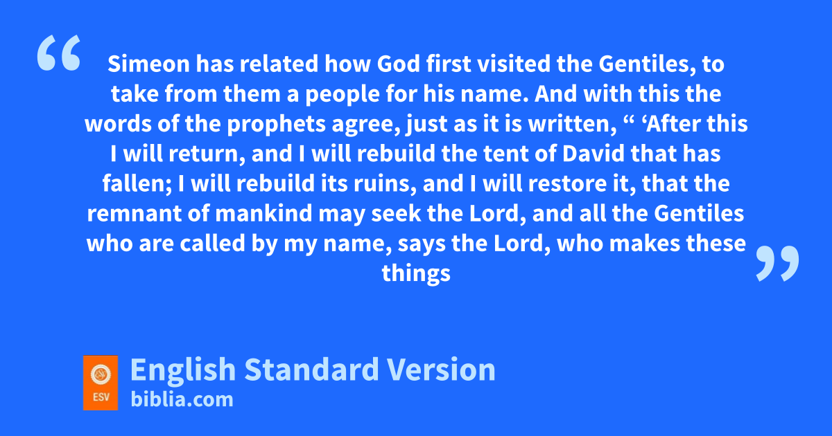 12 And all the assembly fell silent, and they listened to Barnabas and Paul fas they related what signs and wonders God had done through them among the Gentiles. 13 After they finished speaking, gJames replied, “Brothers, listen to me. 14 hSimeon has related how God first visited the Gentiles, to take from them ia people for his name. 15 And with this the words of the prophets agree, just as it is written,