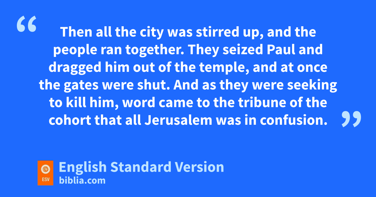 27 When cthe seven days were almost completed, dthe Jews from Asia, eseeing him in the temple, stirred up the whole crowd and laid hands on him, 28 crying out, “Men of Israel, help! This is the man who fis teaching everyone everywhere against the people and gthe law and gthis place. Moreover, he even brought Greeks into the temple and hhas defiled gthis holy place.” 29 For they had previously seen iTrophimus the Ephesian with him in the city, and they supposed that Paul had brought him into the temple. 30 Then all the city was stirred up, and the people ran together. They seized Paul and jdragged him out of the temple, and at once the gates were shut. 31 jAnd as they were seeking to kill him, word came to the tribune of kthe cohort that all Jerusalem was in confusion. 32 lHe at once took soldiers and centurions and ran down to them. And when they saw the tribune and the soldiers, they stopped beating Paul. 33 Then the tribune came up and arrested him and ordered him mto be bound nwith two chains. He inquired who he was and what he had done. 34 oSome in the crowd were shouting one thing, some another. And as he could not learn the facts because of the uproar, he ordered him to be brought into pthe barracks. 35 And when he came to the steps, he was actually carried by the soldiers because of the violence of the crowd, 36 for the mob of the people followed, crying out, q“Away with him!”