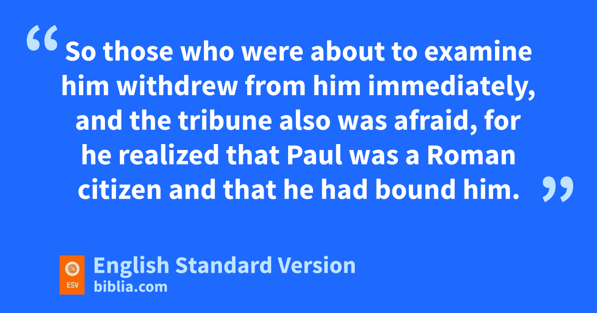 22 Up to this word they listened to him. Then they raised their voices and said, n“Away with such a fellow from the earth! For ohe should not be allowed to live.” 23 And as they were shouting and throwing off their cloaks and flinging dust into the air, 24 the tribune ordered him to be brought into pthe barracks, saying that he should be qexamined by flogging, to find out why they were shouting against him like this. 25 But when they had stretched him out for the whips,4 Paul said to the centurion who was standing by, “Is it lawful for you to flog ra man who is a Roman citizen and uncondemned?” 26 When the centurion heard this, he went to the tribune and said to him, “What are you about to do? For this man is a Roman citizen.” 27 So the tribune came and said to him, “Tell me, are you a Roman citizen?” And he said, “Yes.” 28 The tribune answered, “I bought this citizenship for a large sum.” Paul said, “But I am a citizen by birth.” 29 So those who were about sto examine him withdrew from him immediately, and the tribune also twas afraid, ufor he realized that Paul was a Roman citizen and that vhe had bound him.