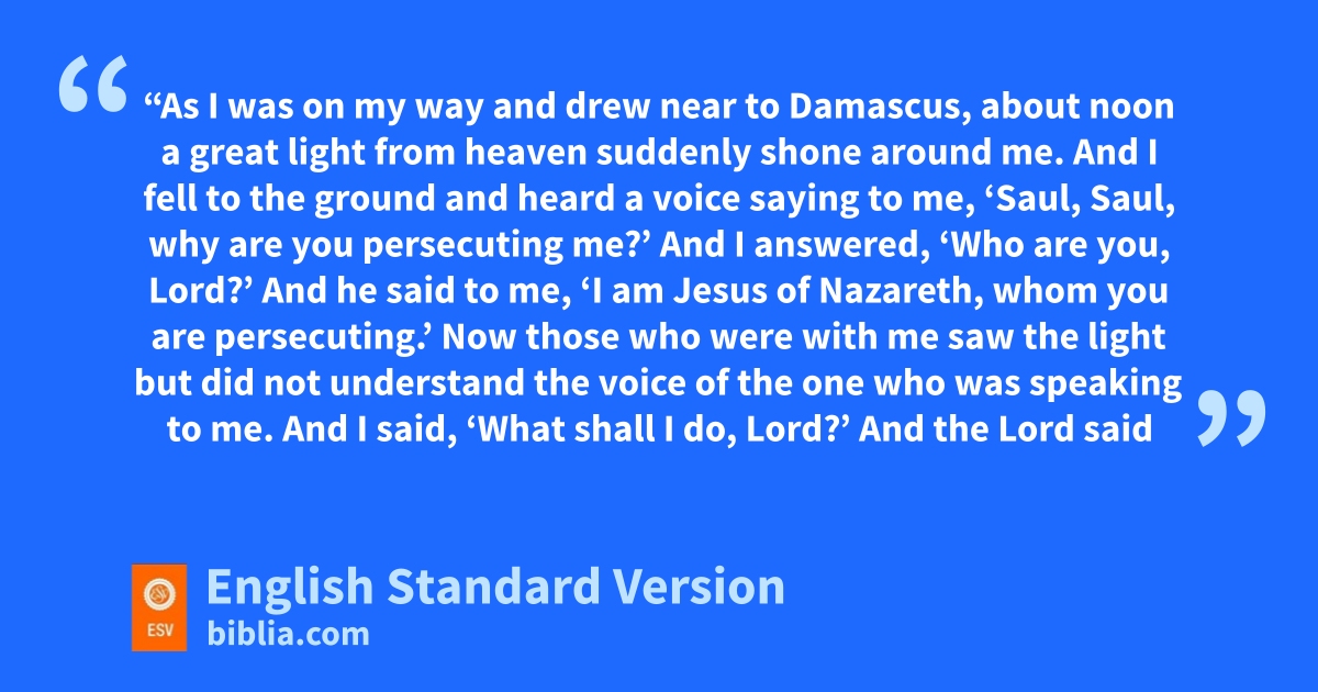 6 k“As I was on my way and drew near to Damascus, about noon a great light from heaven suddenly shone around me. 7 And I fell to the ground and heard a voice saying to me, ‘Saul, Saul, why are you persecuting me?’ 8 And I answered, ‘Who are you, Lord?’ And he said to me, ‘I am lJesus of Nazareth, whom you are persecuting.’ 9 mNow those who were with me saw the light but did not understand3 the voice of the one who was speaking to me. 10 And I said, n‘What shall I do, Lord?’ And the Lord said to me, ‘Rise, and go into Damascus, and there you will be told all that is appointed for you to do.’ 11 And since I could not see because of the brightness of that light, I was led by the hand by those who were with me, and came into Damascus.