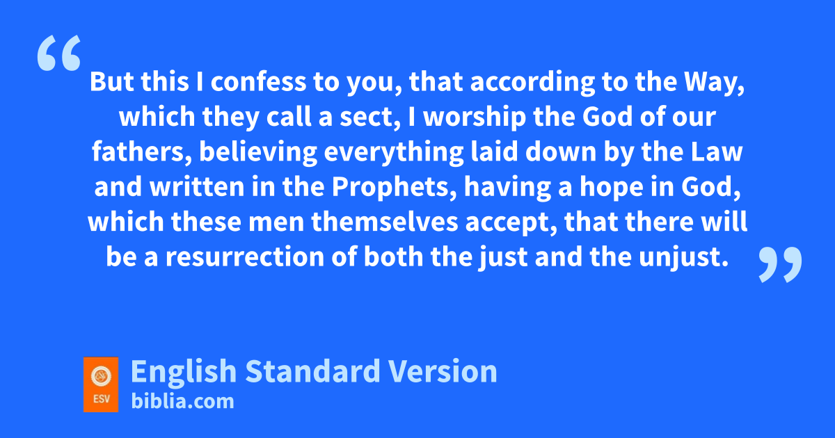 “Knowing that for many years you have been a judge over this nation, I cheerfully make my defense. 11 You can verify that zit is not more than twelve days since I awent up bto worship in Jerusalem, 12 and cthey did not find me disputing with anyone or stirring up a crowd, either in the temple or in the synagogues or in the city. 13 dNeither can they prove to you what they now bring up against me. 14 But this I confess to you, that according to ethe Way, which they call fa sect, gI worship hthe God of our fathers, believing everything ilaid down by the Law and written in the Prophets, 15 jhaving ka hope in God, which these men themselves accept, that there will be la resurrection mof both the just and the unjust. 16 So I always ntake pains to have a oclear conscience toward both God and man. 17 Now pafter several years qI came to bring alms to rmy nation and to present sofferings. 18 While I was doing this, they found me tpurified in the temple, without any crowd or tumult. But usome Jews from Asia— 19 vthey ought to be here before you and to make an accusation, should they have anything against me. 20 Or else let these men themselves say what wrongdoing they found when I stood before the council, 21 other than this one thing wthat I cried out while standing among them: ‘It is with respect to the resurrection of the dead that I am on trial before you this day.’ ”