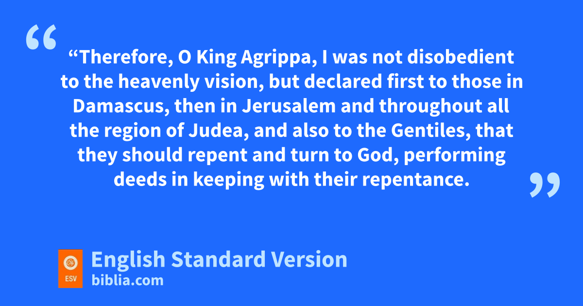 19 “Therefore, O King Agrippa, I was not disobedient to wthe heavenly vision, 20 but declared first xto those in Damascus, ythen in Jerusalem and throughout all the region of Judea, and also zto the Gentiles, that they should arepent and bturn to God, performing deeds cin keeping with their repentance. 21 For this reason dthe Jews seized me in the temple and tried to kill me. 22 eTo this day I have had the help that comes from God, and so fI stand here testifying both to small and great, saying nothing but what gthe prophets and Moses said would come to pass: 23 hthat the Christ imust suffer and that, jby being the first kto rise from the dead, lhe would proclaim mlight both to our people and to the Gentiles.”