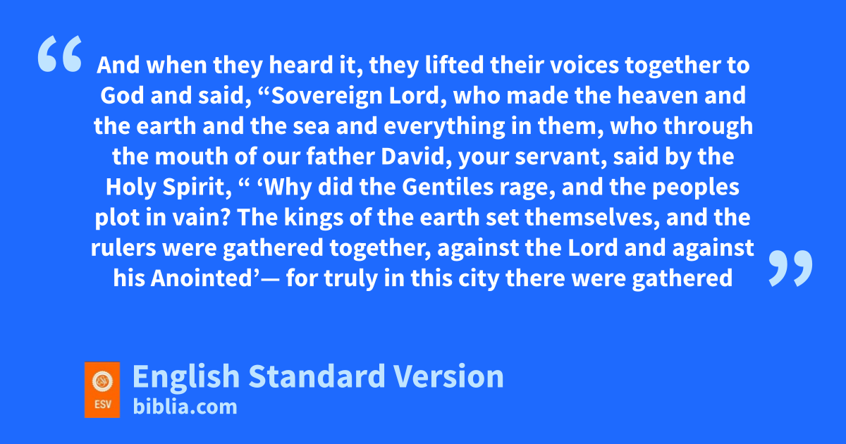 23 When they were released, they went to their friends and reported what the chief priests and the elders had said to them. 24 And when they heard it, they lifted their voices ptogether to God and said, “Sovereign Lord, qwho made the heaven and the earth and the sea and everything in them, 25 who through the mouth of our father David, your servant,4 said by the Holy Spirit,