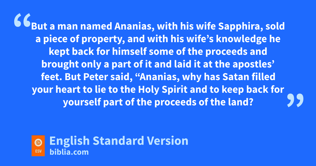 5 But a man named Ananias, with his wife Sapphira, sold a piece of property, 2 and with his wife’s knowledge vhe kept back for himself some of the proceeds and brought only a part of it and wlaid it at the apostles’ feet. 3 But Peter said, “Ananias, why has xSatan filled your heart to lie yto the Holy Spirit and zto keep back for yourself part of the proceeds of the land? 4 While it remained unsold, did it not remain your own? And after it was sold, was it not at your disposal? Why is it that you have contrived this deed in your heart? You have not lied to man but ato God.” 5 When Ananias heard these words, he bfell down and breathed his last. And cgreat fear came upon all who heard of it. 6 The young men rose and dwrapped him up and carried him out and buried him.
