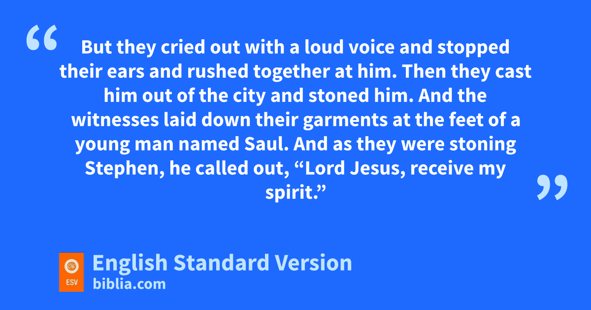 54 Now when they heard these things lthey were enraged, and they mground their teeth at him. 55 But he, nfull of the Holy Spirit, gazed into heaven and saw othe glory of God, and Jesus standing pat the right hand of God. 56 And he said, “Behold, I see qthe heavens opened, and rthe Son of Man standing pat the right hand of God.” 57 But they cried out with a loud voice and stopped their ears and rushed together2 at him. 58 Then sthey cast him out of the city and tstoned him. And uthe witnesses laid down their garments vat the feet of a young man named Saul. 59 And as they were stoning Stephen, whe called out, “Lord Jesus, xreceive my spirit.” 60 And yfalling to his knees he cried out with a loud voice, z“Lord, do not hold this sin against them.” And when he had said this, ahe fell asleep.