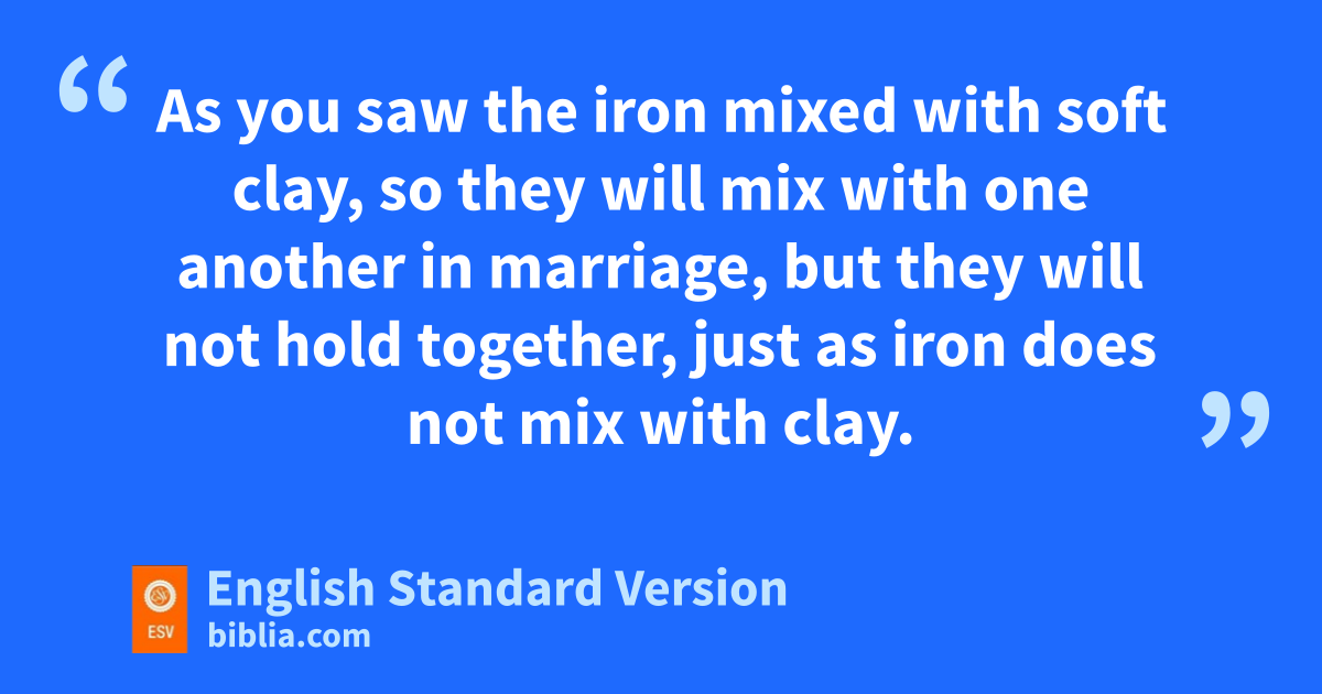 36 “This was the dream. Now we will tell the king its interpretation. 37 You, O king, rthe king of kings, to whom sthe God of heaven thas given the kingdom, the power, and the might, and the glory, 38 and into whose hand he has given, wherever they dwell, the children of man, uthe beasts of the field, and the birds of the heavens, making you rule over them all—you are vthe head of gold. 39 wAnother kingdom inferior to you shall arise after you, and yet a third kingdom vof bronze, xwhich shall rule over all the earth. 40 And ythere shall be a fourth kingdom, strong as iron, because iron zbreaks to pieces and shatters all things. And like iron that crushes, it shall zbreak and crush all these. 41 And as you saw athe feet and toes, partly of potter’s clay and partly of iron, it shall be a divided kingdom, but some of the yfirmness of iron shall be in it, just as you saw iron mixed with the soft clay. 42 And as the toes of the feet were partly iron and partly clay, so the kingdom shall be partly strong and partly brittle. 43 As you saw the iron mixed with soft clay, so they will mix with one another in marriage,3 but they will not hold together, just as iron does not mix with clay. 44 And in the days of those kings bthe God of heaven will set up ca kingdom that shall never be destroyed, nor shall the kingdom be left to another people. dIt shall break in pieces all these kingdoms and bring them to an end, and cit shall stand forever, 45 just as eyou saw that fa stone was cut from a mountain by no human hand, and that dit broke in pieces the iron, the bronze, the clay, the silver, and the gold. A ggreat God has made known to the king what shall be after this. The dream is certain, and its interpretation sure.”