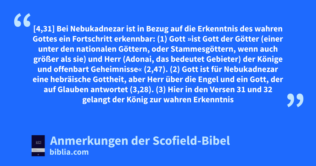 (1) Nebukadnezar (ca. 604–562 v.Chr.), mit dem die Gefangenschaft Judas und »die Zeiten der Nationen« begannen (siehe Lk 21,24 und Offb 16,19, Fußnoten) und der das erste der vier Weltreiche aufrichtete (2,37.38; 7,4).