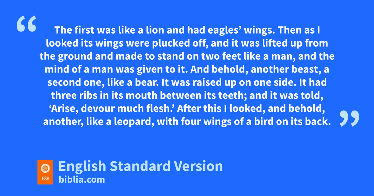 7 In the first year of pBelshazzar king of Babylon, qDaniel saw a dream and rvisions of his head as he lay in his bed. Then he wrote down the dream and told the sum of the matter. 2 Daniel declared,1 “I saw in my vision by night, and behold, sthe four winds of heaven were stirring up the great sea. 3 And four great beasts tcame up out of the sea, different from one another. 4 The first was like a lion and had eagles’ wings. Then as I looked its wings were plucked off, and it was lifted up from the ground and made to stand on two feet like a man, and the mind of a man was given to it. 5 And behold, uanother beast, a second one, like a bear. It was raised up on one side. It had three ribs in its mouth between its teeth; and it was told, ‘Arise, devour much flesh.’ 6 After this I looked, and behold, another, like a vleopard, with four wings of a bird on its back. And the beast had four heads, and wdominion was given to it. 7 After this I saw in the night visions, and behold, a fourth beast, xterrifying and dreadful and exceedingly strong. It had great iron teeth; xit devoured and broke in pieces xand stamped what was left with its feet. It was different from all the beasts that were before it, and yit had ten horns. 8 I considered the horns, and behold, zthere came up among them another horn, a little one, zbefore which three of the first horns were plucked up by the roots. And behold, in this horn were eyes like the eyes of a man, and aa mouth speaking great things.