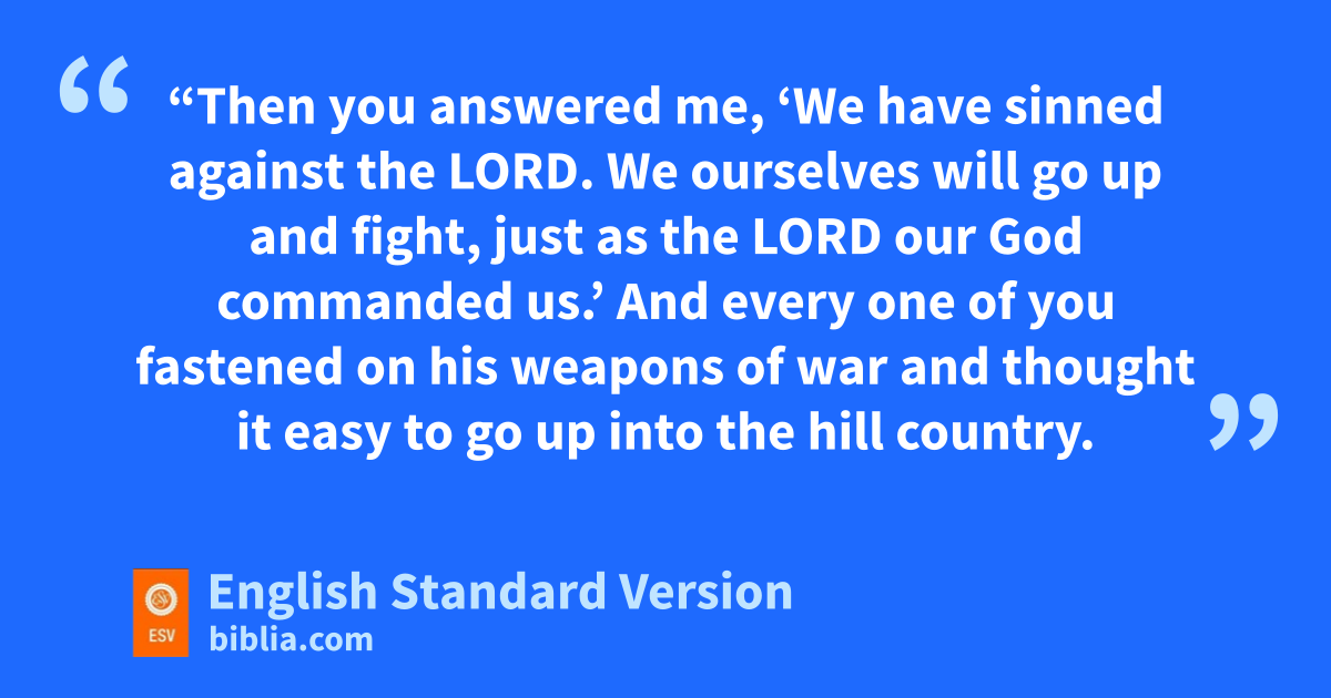 41 “Then you answered me, w‘We have sinned against the Lord. We ourselves will go up and fight, just as the Lord our God commanded us.’ And every one of you fastened on his weapons of war and thought it easy to go up into the hill country. 42 And the Lord said to me, x‘Say to them, Do not go up or fight, yfor I am not in your midst, lest you be defeated before your enemies.’ 43 So I spoke to you, and you would not listen; but you rebelled against the command of the Lord and zpresumptuously went up into the hill country. 44 aThen the Amorites who lived in that hill country came out against you and chased you bas bees do and beat you down in Seir as far as cHormah. 45 And you returned and wept before the Lord, but the Lord did not listen to your voice or give ear to you. 46 So dyou remained at Kadesh many days, the days that you remained there.